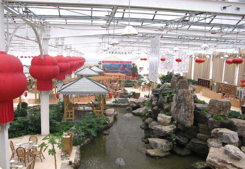 生態餐廳是綜合運用建筑學、園林學、設施園藝學、生態學等相關學科知識進行規劃、設計和建設,以設施調控技術、農藝栽培及管理技術來維護餐廳的優美環境,形成以綠色景觀植物為主,蔬、果、花、草、藥為輔的植物配置格局,結合假山、瀑布、小橋流水、竹木亭閣等園林景觀,全方位立體展現綠色、優美、宜人的就餐環境。